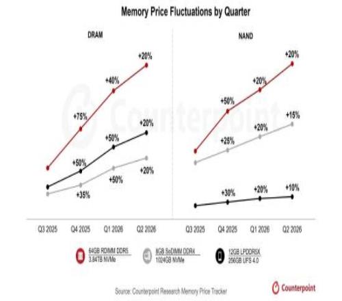 在这种情况下,预计2025年Q4存储价格将飙升40%–50%;2026年Q1还将再涨40%–50%,2026年Q2预计再上涨约20%。
